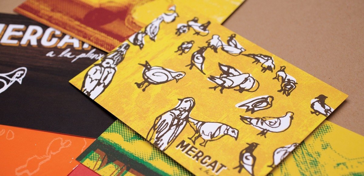 Large mirrored murals echo Barcelona street scenes, while hand-drawn illustrations show people gathering and pigeons lingering in plazas. Menus, stickers, and T-shirts feel like artifacts you might find at a market stall. You do not need an explanation. You feel it immediately.